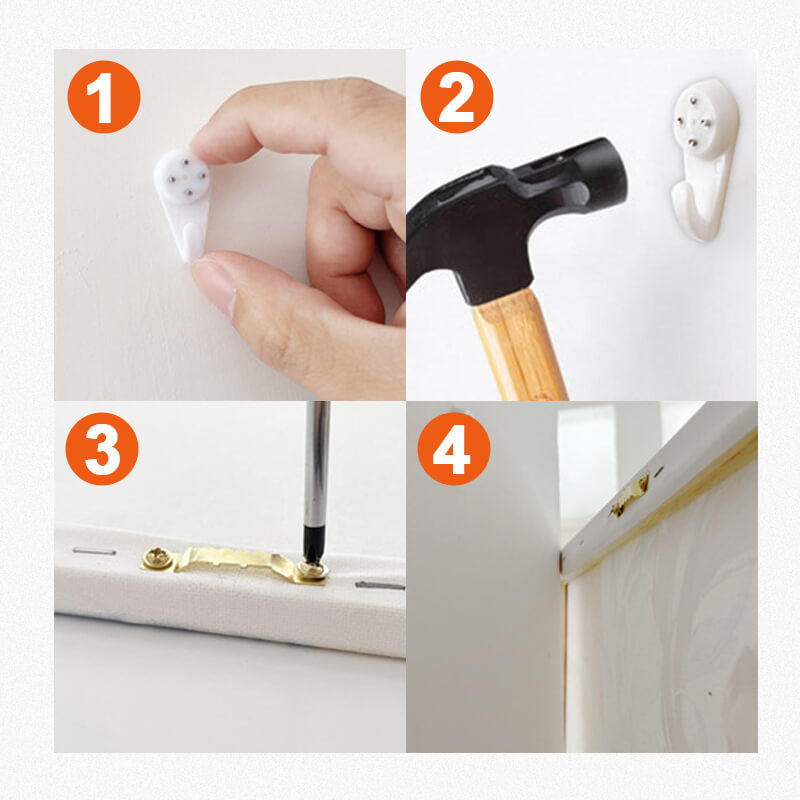 Package include: 1xCanvas, 1 set of paint& brush, triangular hook, inner frame