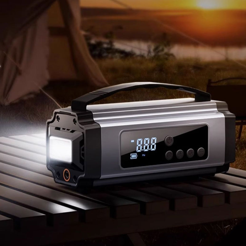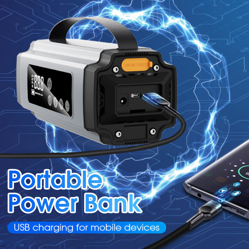 PORTABLE POWER BANK: Functions as a mobile power supply with USB output for charging smartphones, tablets, and other electronics. Includes LED lighting, flash warning mode, and portable storage design for convenience on the road.