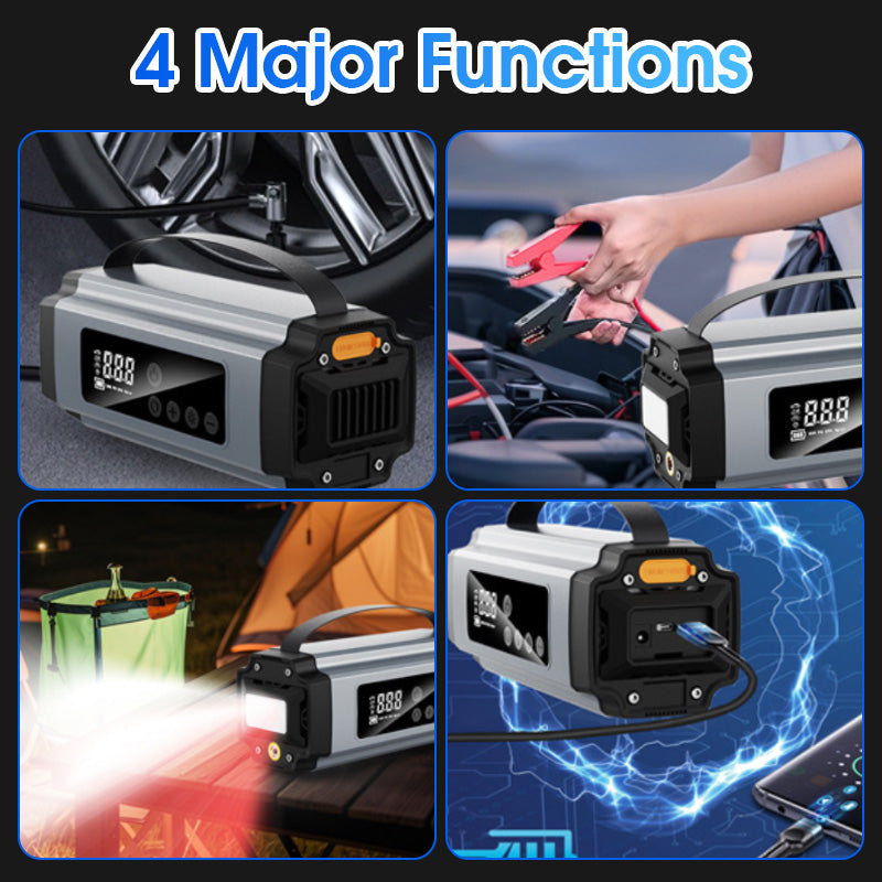 DUAL-FUNCTION POWER: Combines a powerful car jump starter with a smart air compressor in one compact unit. Perfect for emergency engine restarts and tire inflation, ensuring you’re always prepared for breakdowns or flat tires during travel.