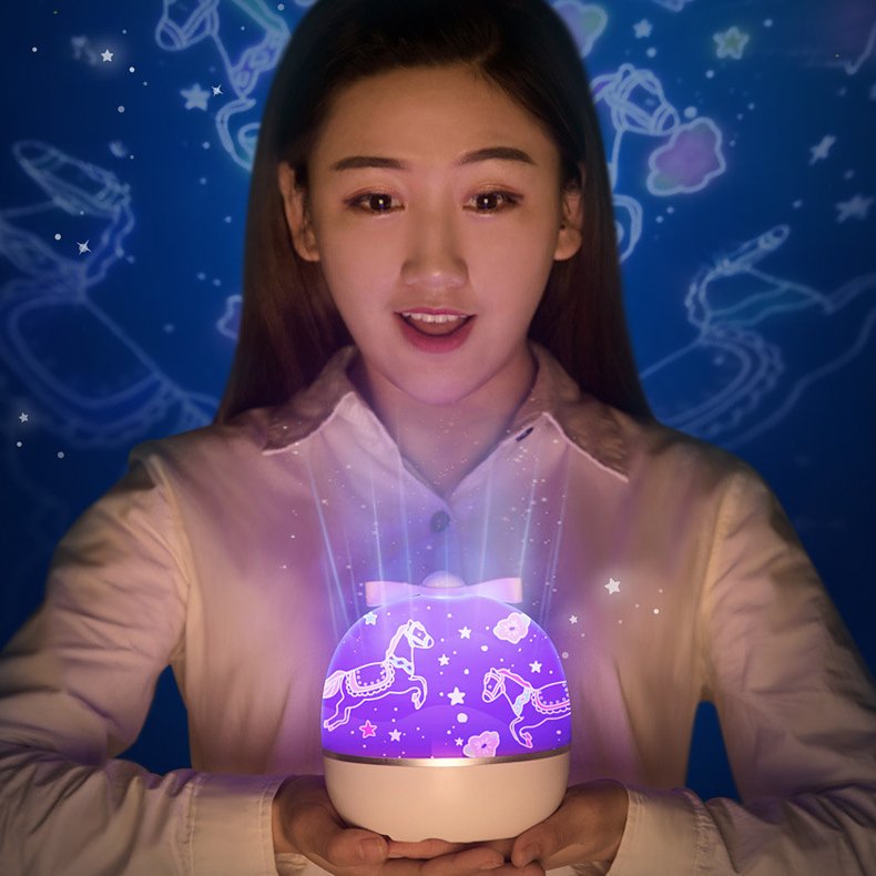 6 Different Films,switch lighting effects at will:The starry night light projects Magical Universe,Ocean Undersea ,Rotating Trojan,Happy Birthday and Rose Garden,Lucky Deer around a room, thereby transforming the room into a relaxing environment at night. It gives your kids and wife comfort and a feeling of relaxation at night while allowing you to enjoy a romantic moment with your partner.
