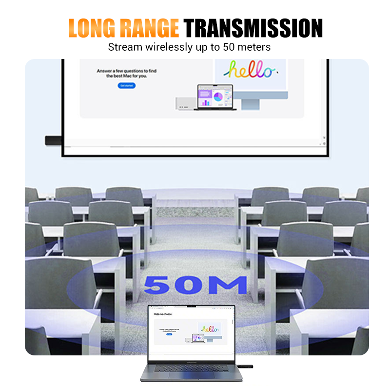 LONG-RANGE WIRELESS TRANSMISSION - Eliminate cable clutter and present with freedom. This device reliably transmits your screen up to 50 meters away, making it the perfect solution for large conference rooms, classrooms, and auditoriums.